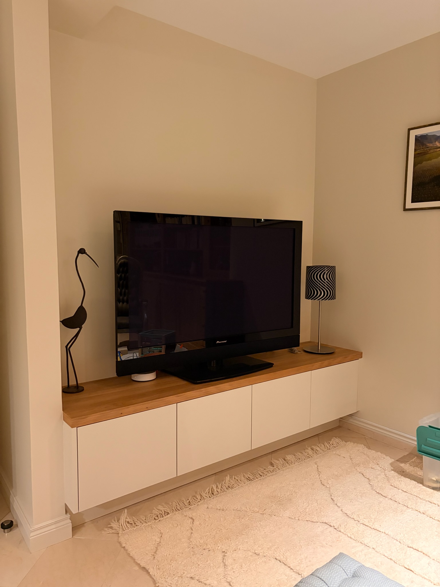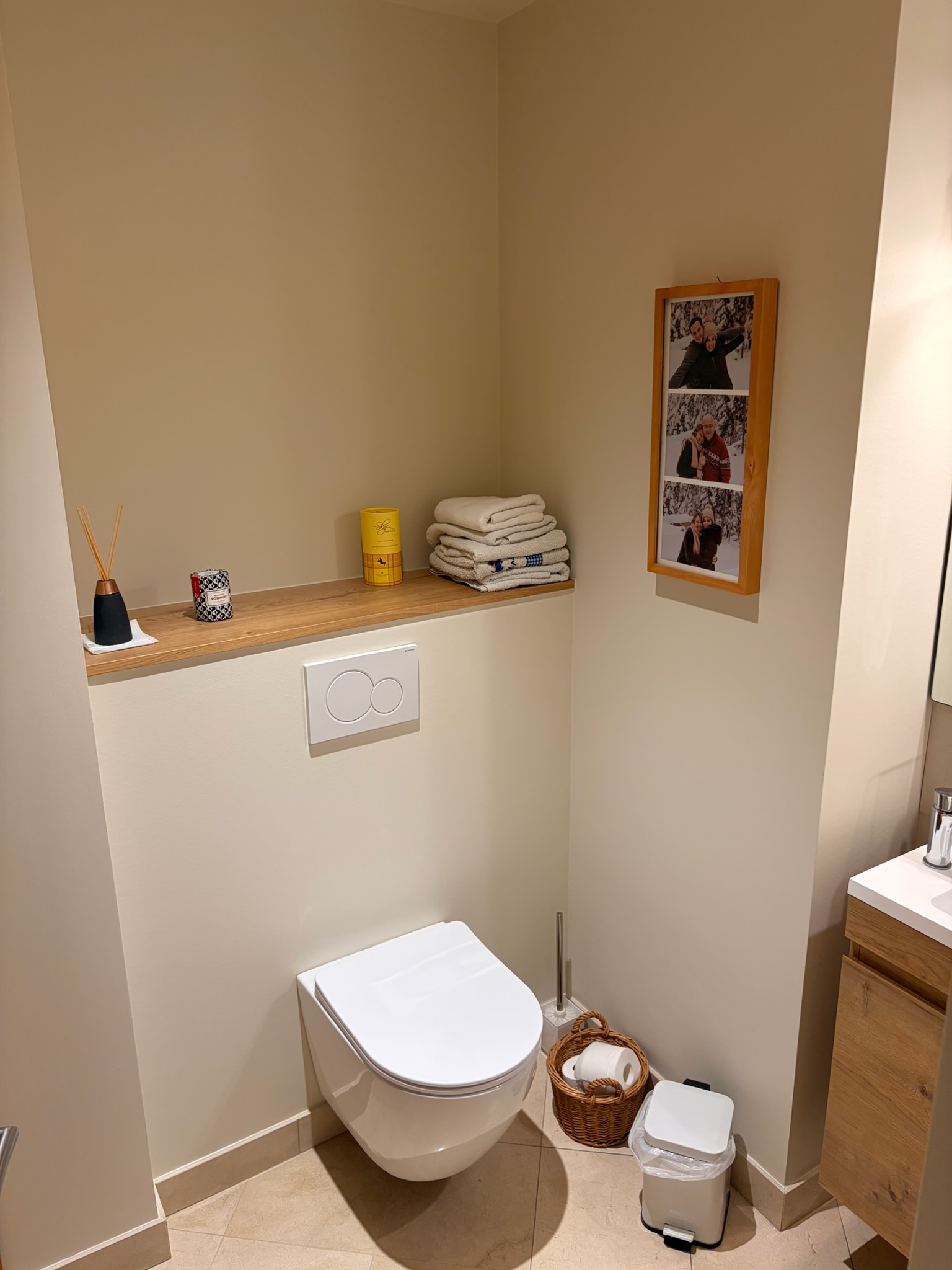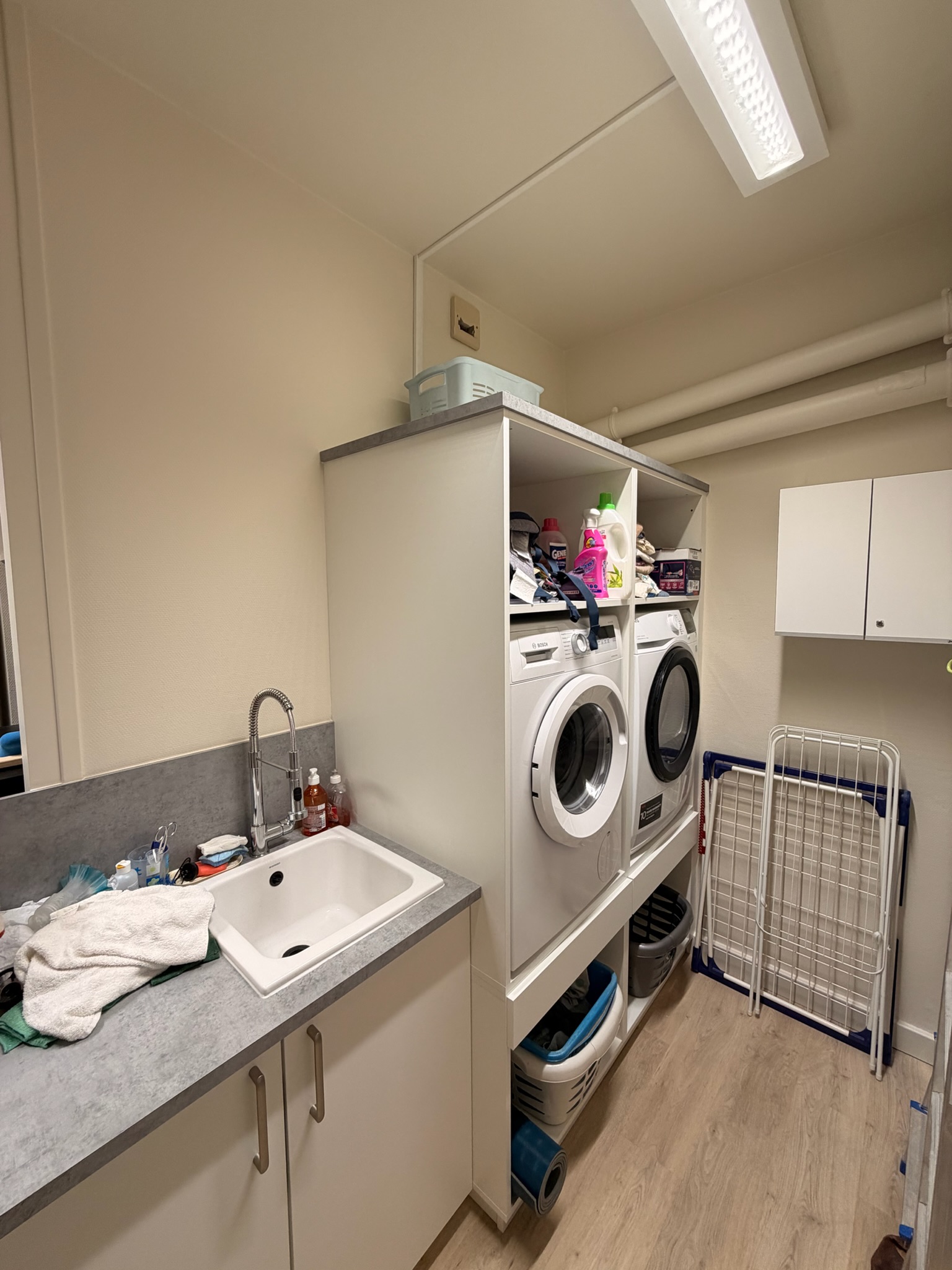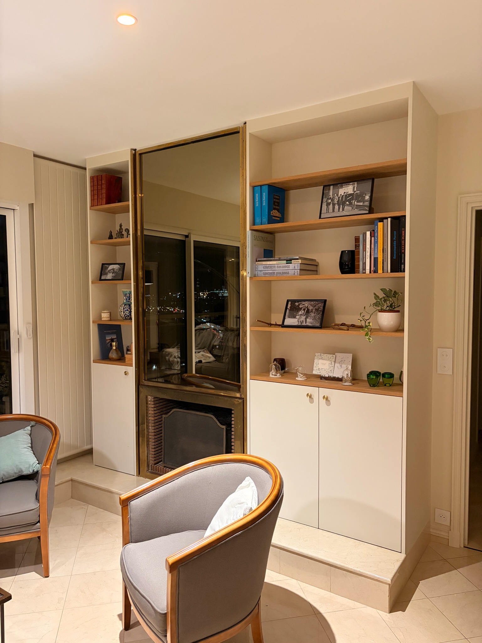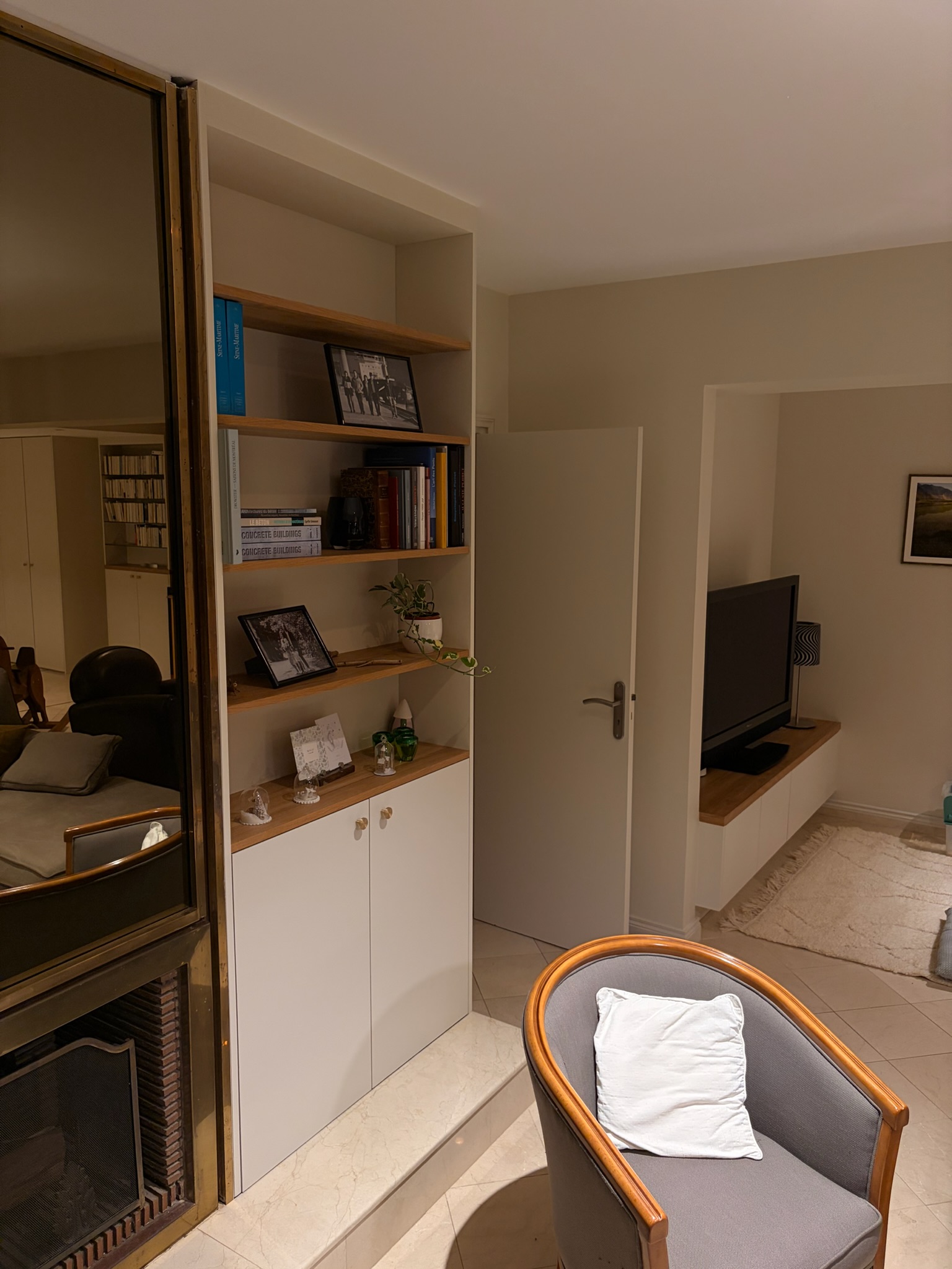 Réalisation d’un aménagement complet comprenant dressing, bibliothèque, bureau et buanderie pour la rénovation de cet appartement. Le chêne vernis se marie aux façades peintes dans la teinte des murs pour une intégration discrète, relevée par des détails de quincaillerie dorée