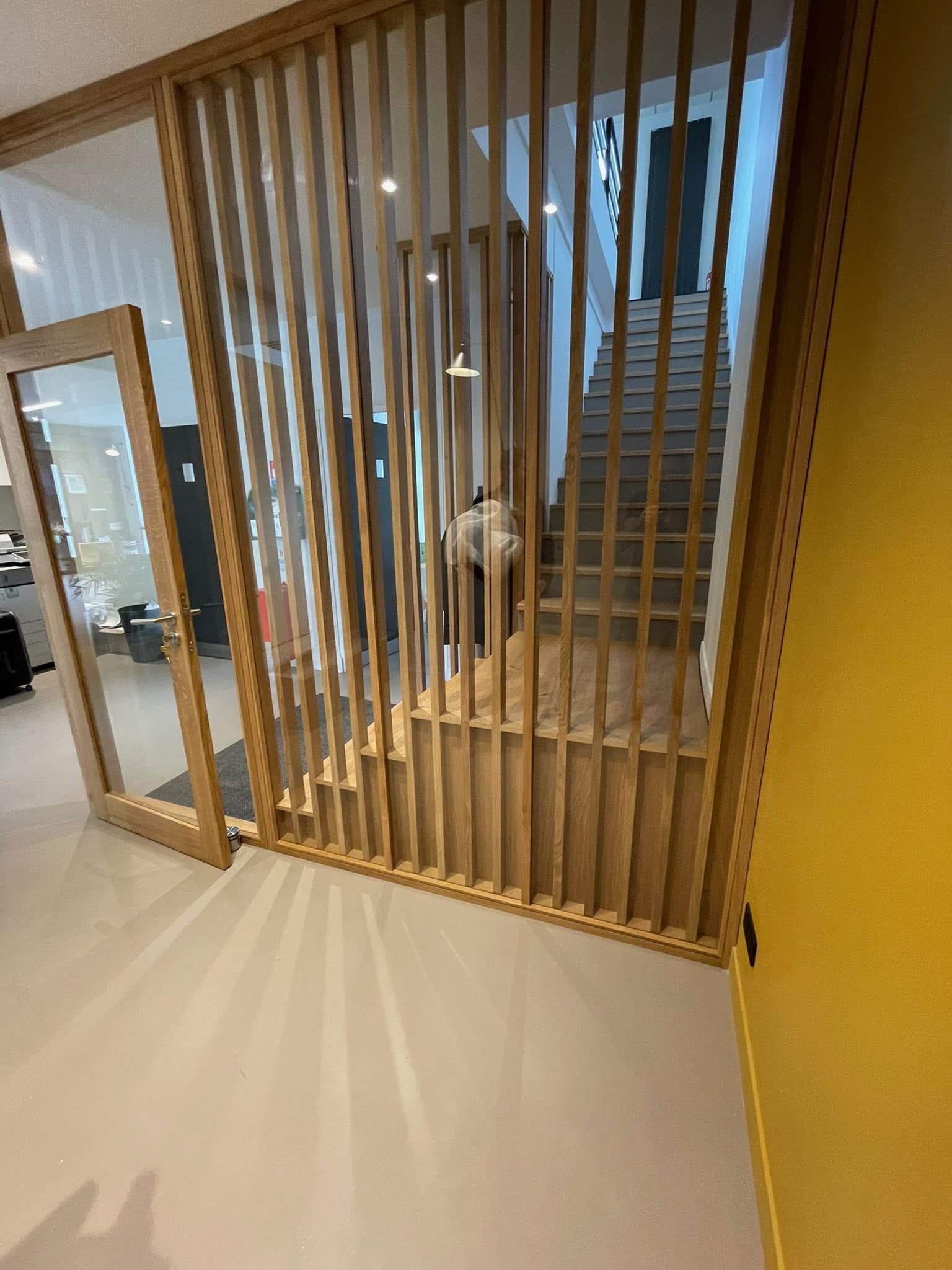 Création d'un bureau fermé au Havre, isolé par une cloison vitrée et un claustra en chêne massif. Cet agencement permet de disposer d'un espace de travail indépendant tout en préservant la luminosité naturelle et la chaleur du bois.