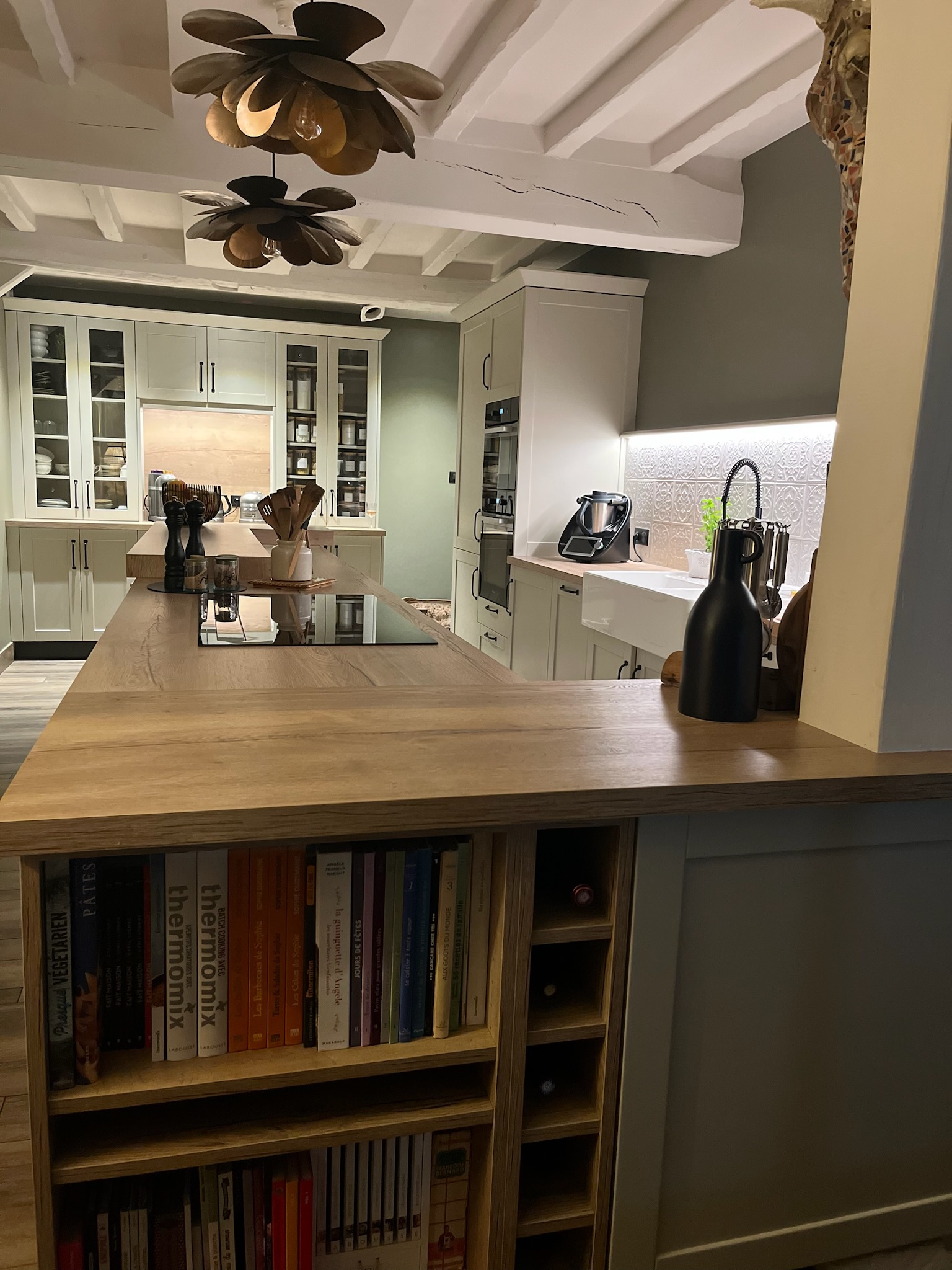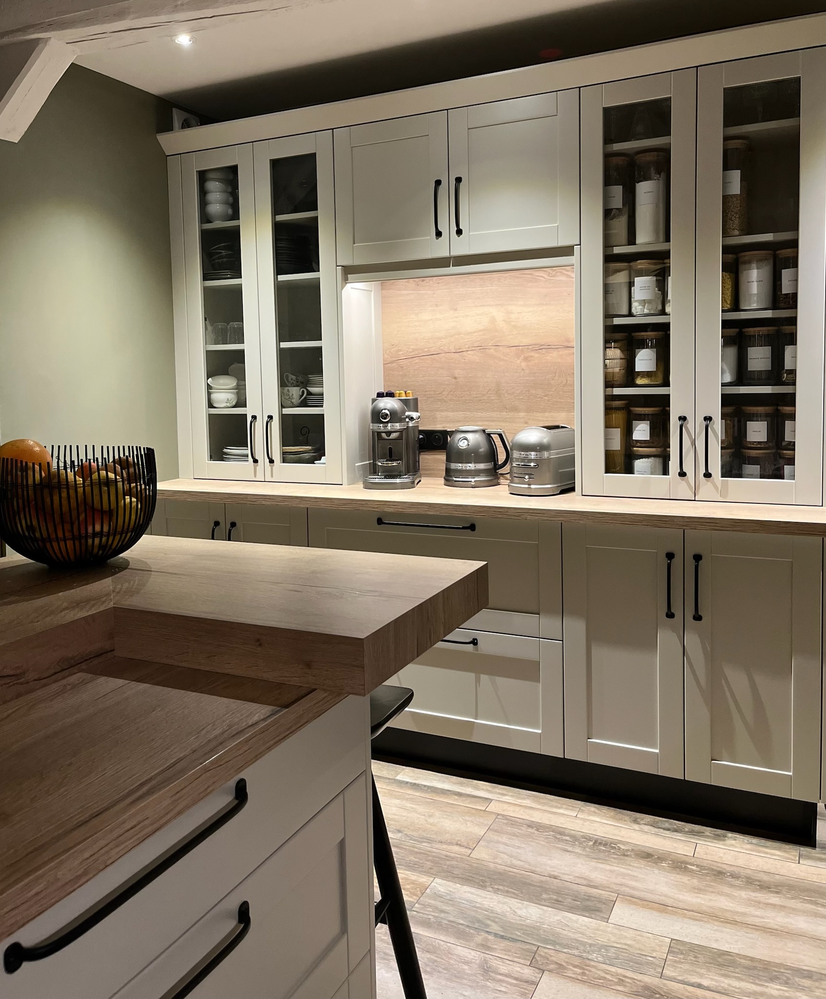 Conçue pour s’intégrer dans le cadre authentique d’une chaumière, cette cuisine affiche un style à la fois chic et intemporel. Elle associe des façades à cadre laqué à un buffet vitré, tandis que le plan de travail en chêne Halifax et les poignées noires rustiques complètent cet aménagement équipé d'une hotte escamotable pour une discrétion totale.