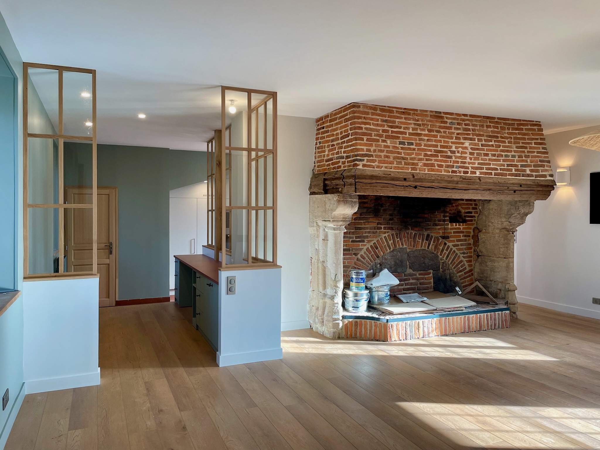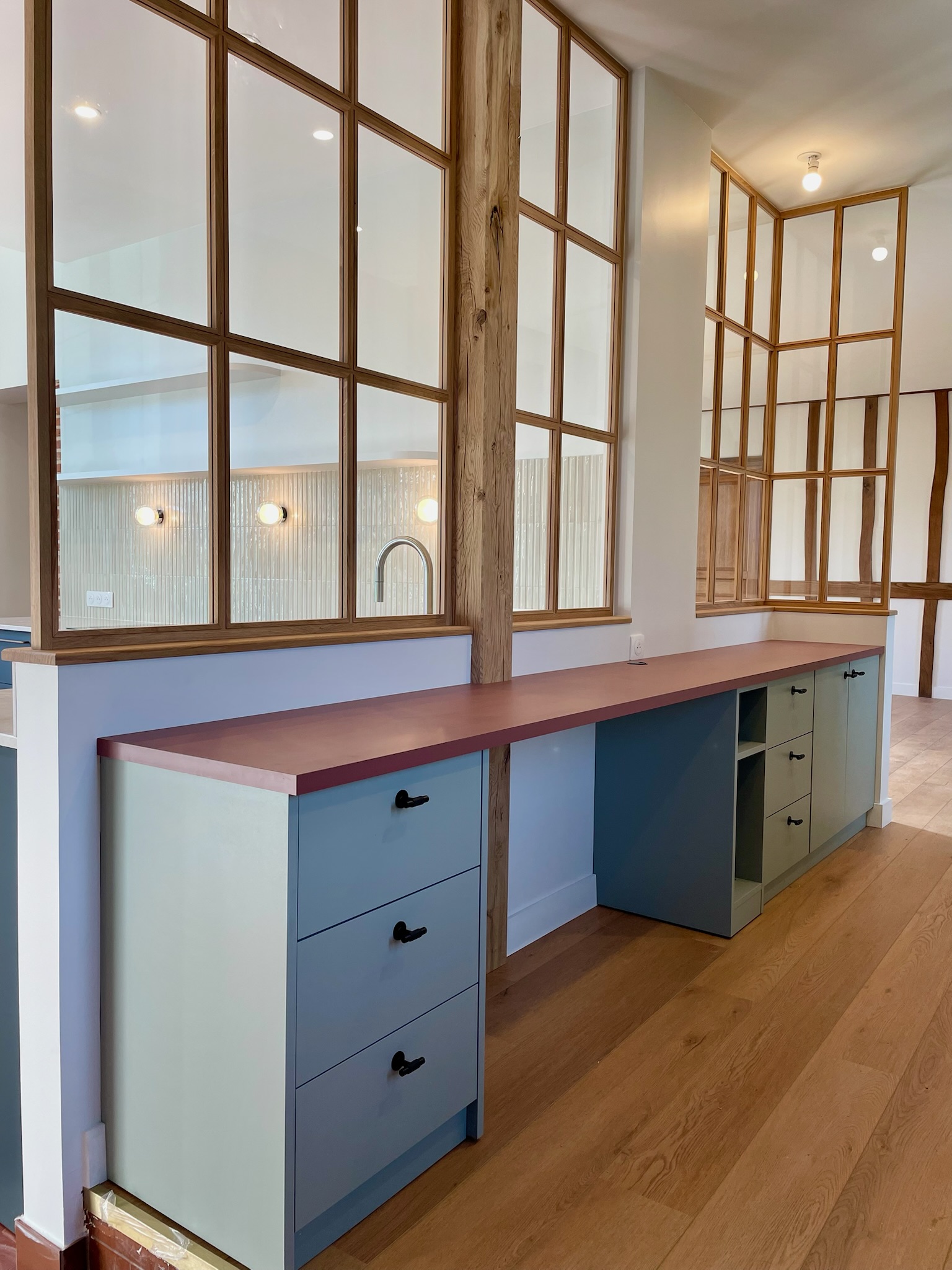 Cette cuisine s'intègre au cachet d'un ancien corps de ferme, mêlant matériaux naturels et lignes contemporaines. Elle associe une verrière en chêne, des façades au coloris stone et un plan de travail en céramique, tandis que le mur technique a été conçu pour épouser parfaitement les volumes et les contraintes structurelles de la bâtisse.