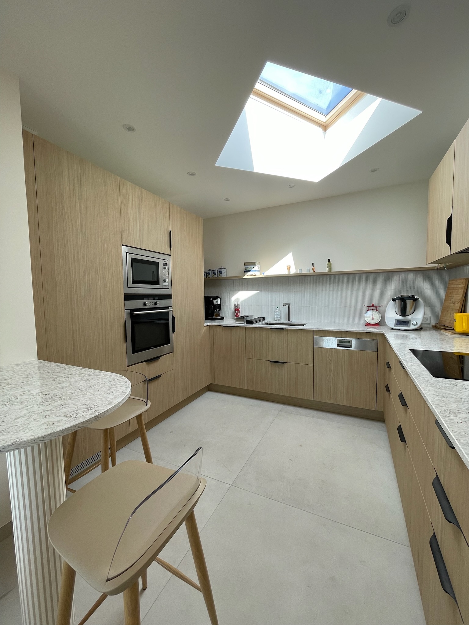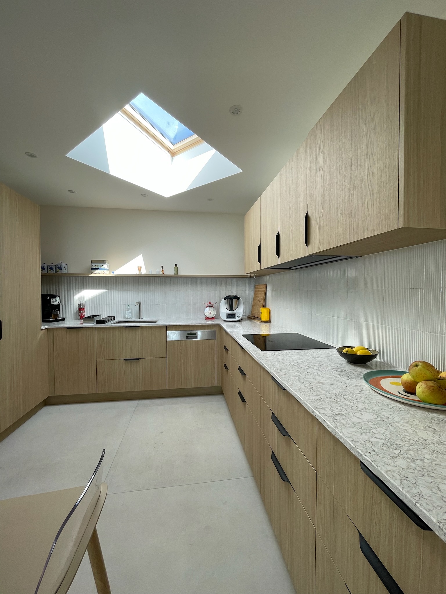 D'après le concept de l'architecte VB Intérieur, cette cuisine met en œuvre des façades en Master Oak associées à un plan de travail Pierre de Plan. L'aménagement a été pensé pour tirer parti du puits de lumière existant, apportant une clarté naturelle qui valorise les textures et les matériaux de la pièce.
