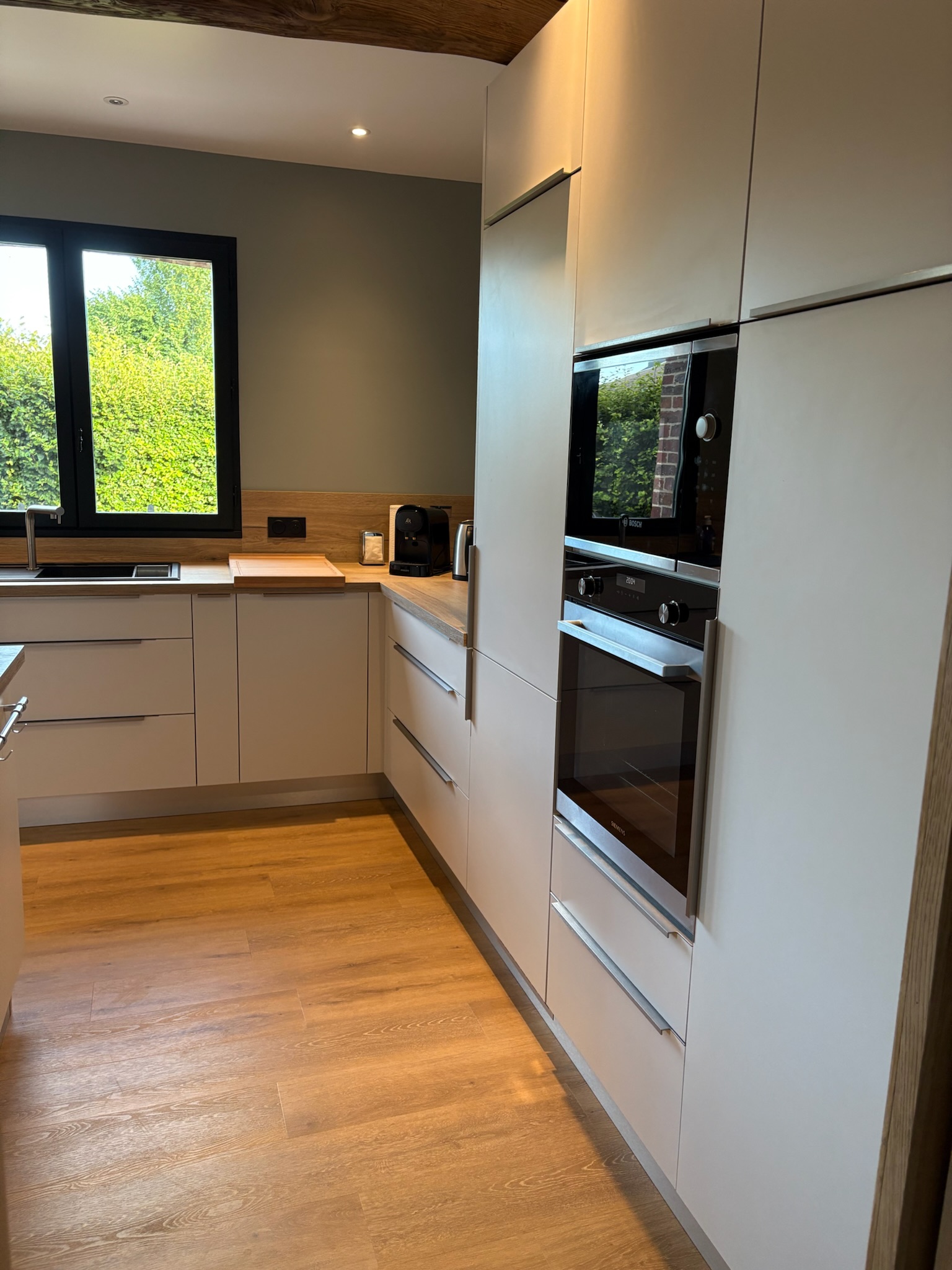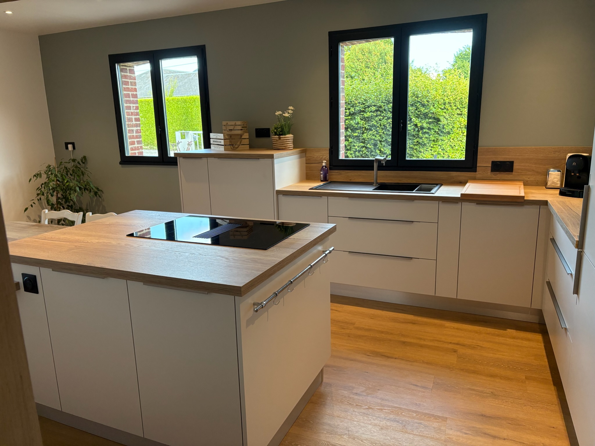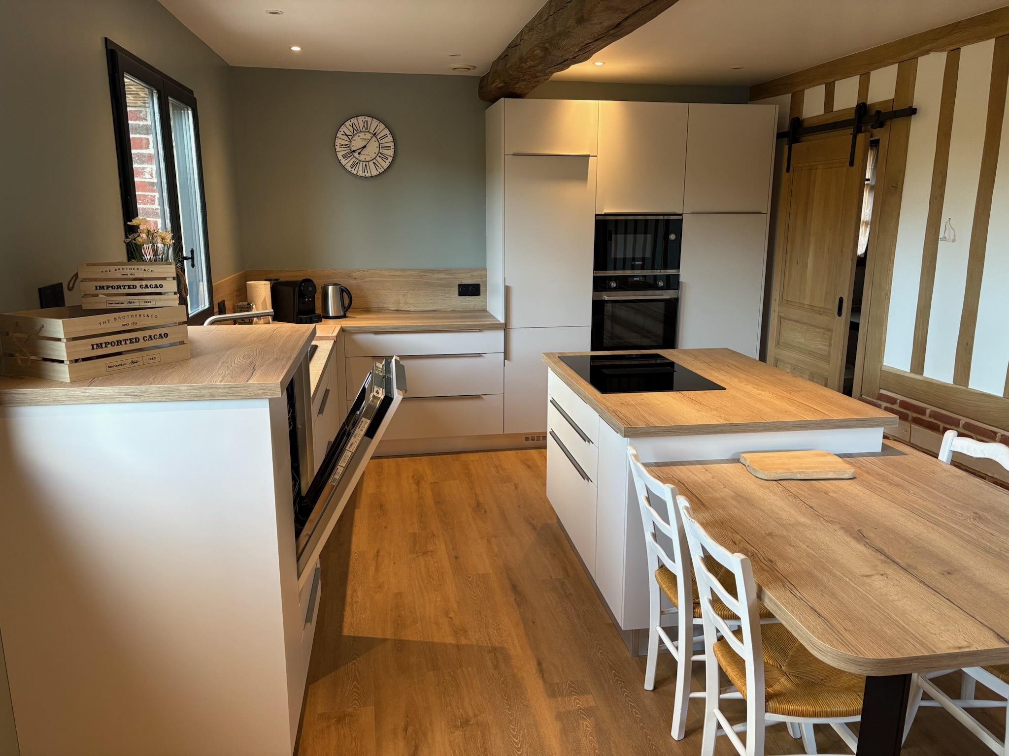 Cette cuisine s'organise autour d'un îlot central avec une table intégrée, créant un espace de vie convivial et lumineux. L'aménagement privilégie l'ergonomie avec l'installation d'un lave-vaisselle surélevé pour un meilleur confort d'utilisation au quotidien, le tout dans des tons clairs et épurés.