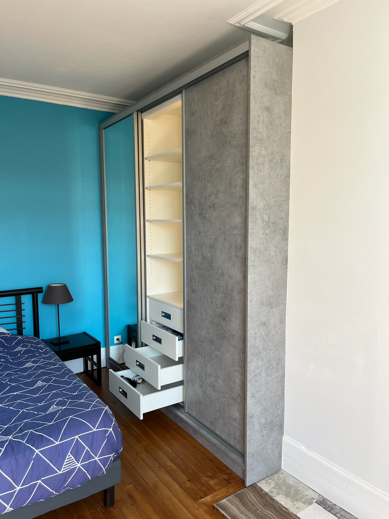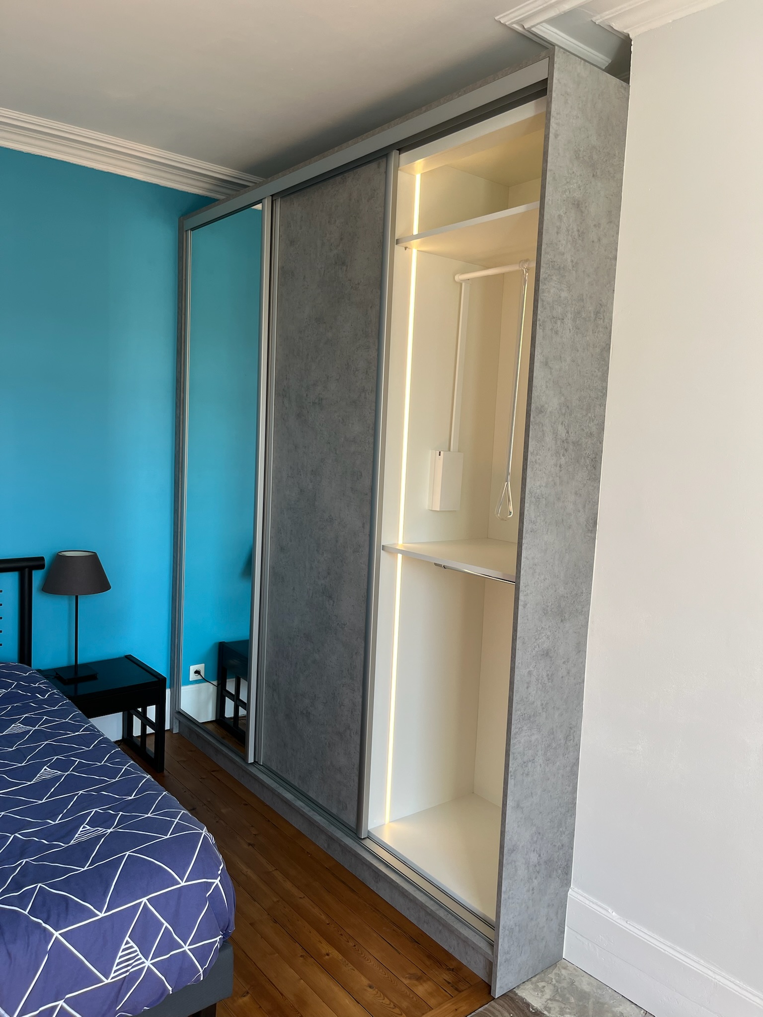 Aménagement fonctionnel d’un dressing au Havre avec des portes coulissantes. L’association d’un décor effet béton et de miroirs mise sur la sobriété, complétée par un éclairage LED intérieur pour un usage quotidien pratique.